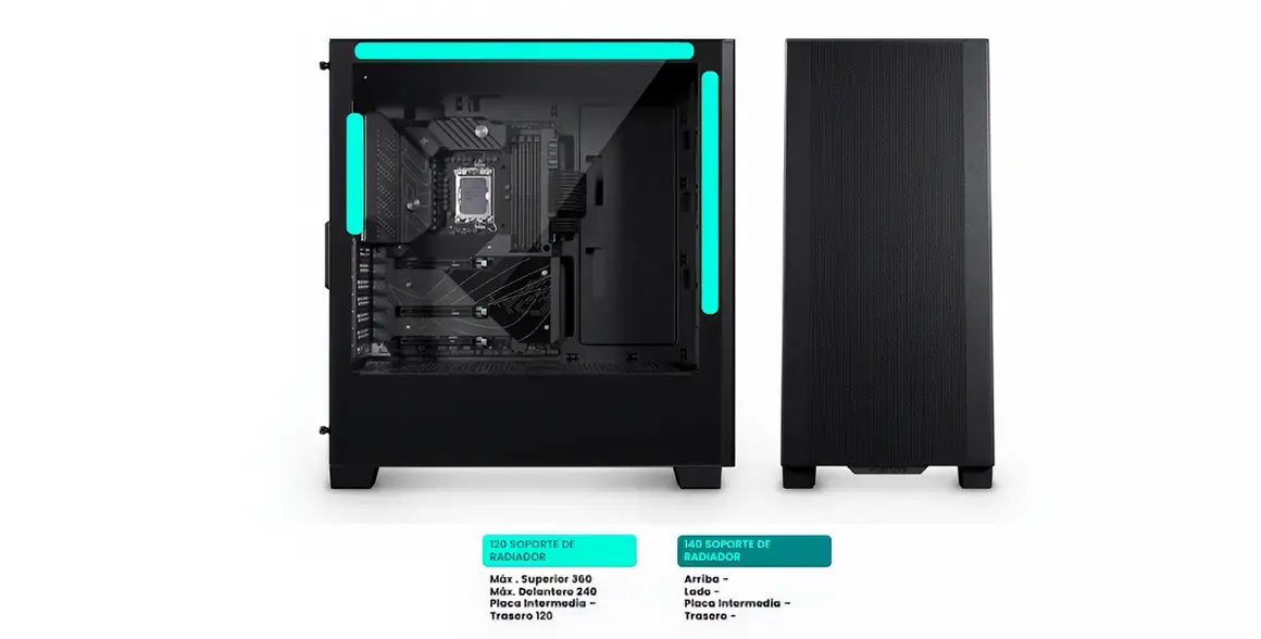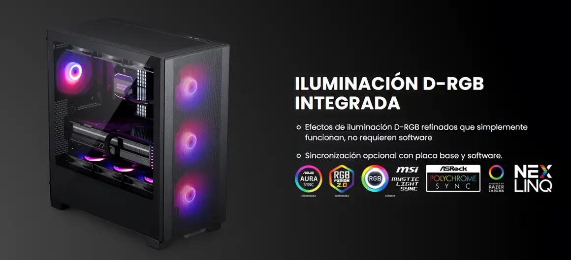 - Ventiladores D-RGB M25-140 Incluidos: Experimenta la iluminación vibrante y personalizable con los 4 ventiladores D-RGB M25-140 incluidos. Estos ventiladores no solo ofrecen un rendimiento excepcional, sino que también añaden un toque estético único a tu sistema, proporcionando efectos de iluminación impresionantes.
