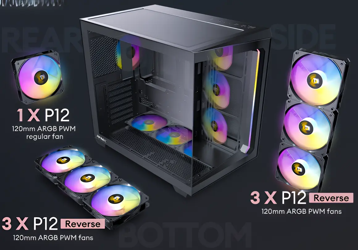 Gestión térmica superior. Equipada de serie con tres ventiladores laterales de 120 mm, mas 3 ventiladores inferiores de 120 mm y uno trasero de 120 mm, la Antec Constellation Black ARGB garantiza un flujo de aire eficaz para mantener componentes de alto rendimiento operando a baja temperatura incluso en sesiones de trabajo o gaming intensivo.