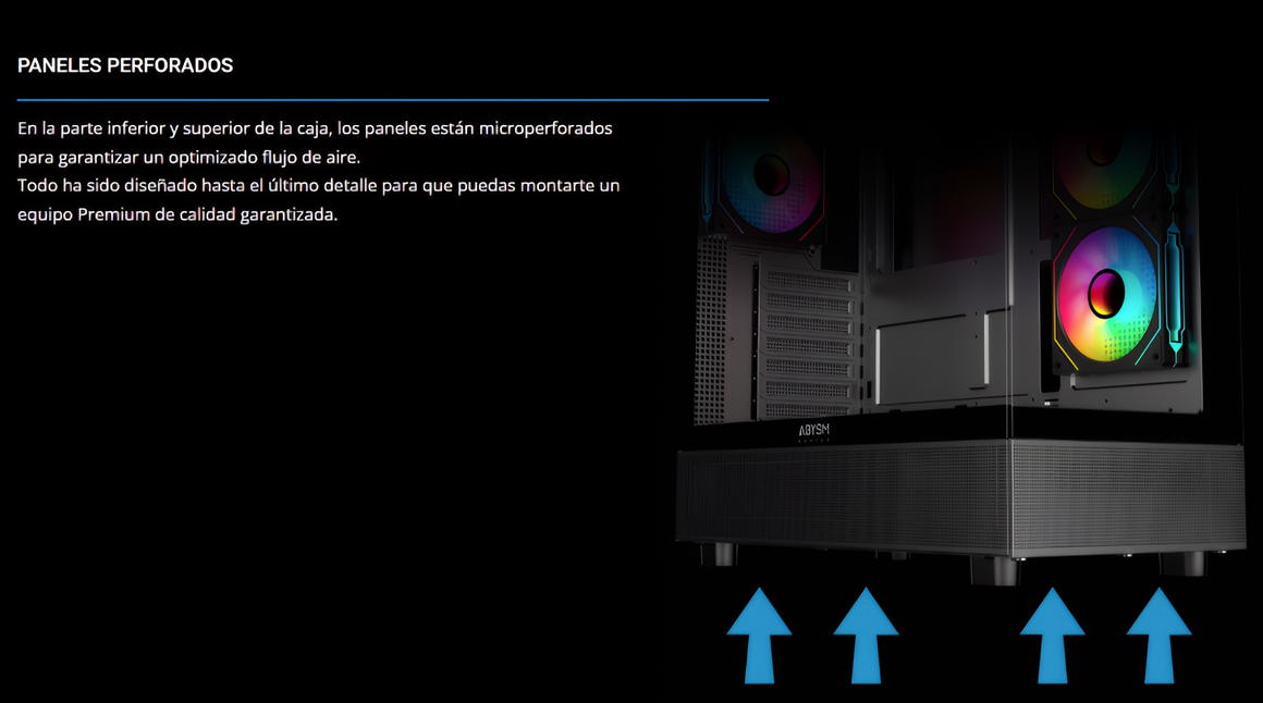 - Paneles perforados: En la parte inferior y superior de la caja, los paneles están microperforados para garantizar un optimizado flujo de aire. Todo ha sido diseñado hasta el último detalle para que puedas montarte un equipo Premium de calidad garantizada.