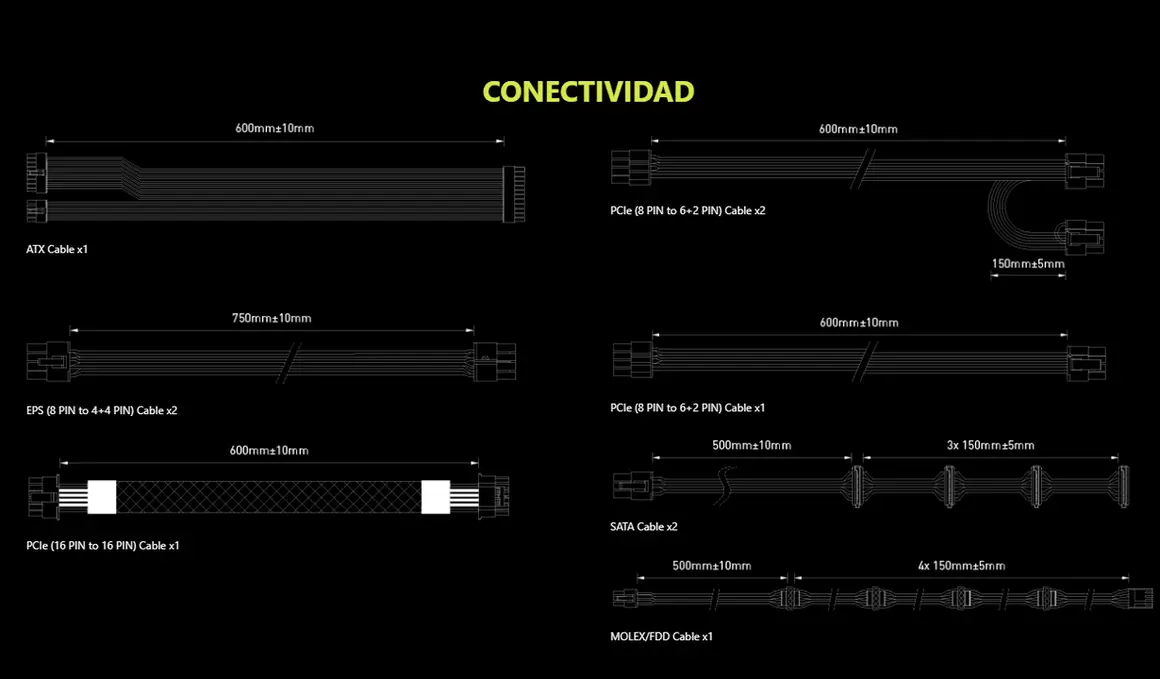 - Diseño modular completo, cables planos