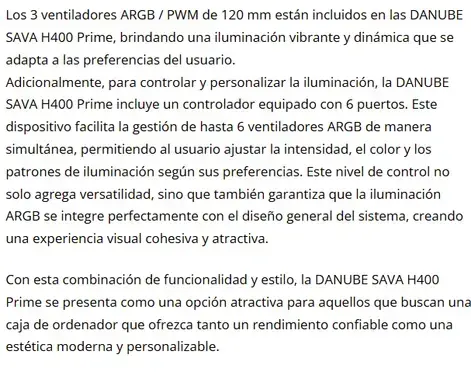 - Increíble iluminación ARGB: Los 3 ventiladores ARGB / PWM de 120 mm están incluidos en las DANUBE SAVA H400 Prime, brindando una iluminación vibrante y dinámica que se adapta a las preferencias del usuario. Adicionalmente, para controlar y personalizar la iluminación, la DANUBE SAVA H400 Prime incluye un controlador equipado con 6 puertos. Este dispositivo facilita la gestión de hasta 6 ventiladores ARGB de manera simultánea, permitiendo al usuario ajustar la intensidad, el color y los patrones de iluminación según sus preferencias. Este nivel de control no solo agrega versatilidad, sino que también garantiza que la iluminación ARGB se integre perfectamente con el diseño general del sistema, creando una experiencia visual cohesiva y atractiva. Con esta combinación de funcionalidad y estilo, la DANUBE SAVA H400 Prime se presenta como una opción atractiva para aquellos que buscan una caja de ordenador que ofrezca tanto un rendimiento confiable como una estética moderna y personalizable.