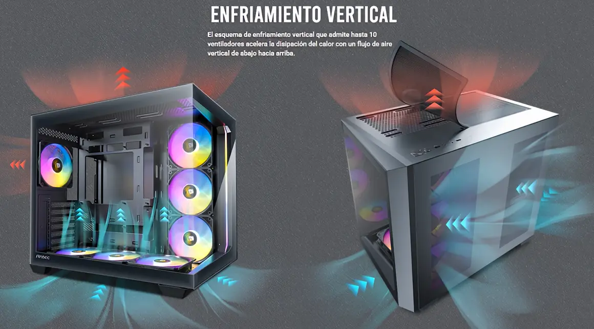 Gestión térmica superior. Equipada de serie con tres ventiladores laterales de 120 mm, mas 3 ventiladores inferiores de 120 mm y uno trasero de 120 mm, la Antec Constellation Black ARGB garantiza un flujo de aire eficaz para mantener componentes de alto rendimiento operando a baja temperatura incluso en sesiones de trabajo o gaming intensivo.