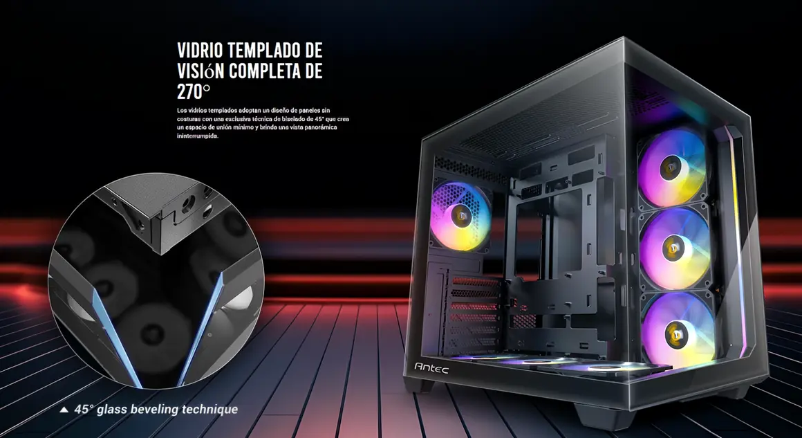 Diseño premium y robustez. Construida con panel lateral de vidrio templado y chasis en acero y plástico reforzado, la Antec Constellation Black ARGB facilita la exhibición de hardware con una estética limpia y profesional, ideal para setups donde el hardware cobra protagonismo.