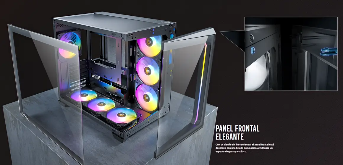 Diseño premium y robustez. Construida con panel lateral de vidrio templado y chasis en acero y plástico reforzado, la Antec Constellation Black ARGB facilita la exhibición de hardware con una estética limpia y profesional, ideal para setups donde el hardware cobra protagonismo.