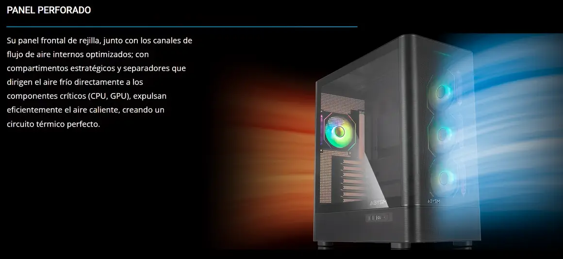 Incluye 4 ventiladores ARGB PWM de 120 mm preinstalados (ampliable hasta 10), permitiendo una personalización total de la iluminación y manteniendo un entorno térmico óptimo incluso bajo cargas intensivas. Su diseño modular ofrece compatibilidad con placas base ATX, Micro ATX y Mini-ITX, así como espacio para tarjetas gráficas de hasta 400 mm y refrigeraciones líquidas avanzadas de hasta 420 mm en el radiador superior.