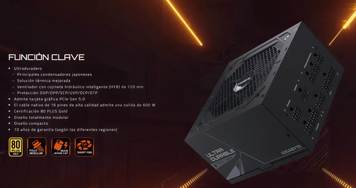 La fuente de alimentación Gigabyte hereda el espíritu de diseño de producto de GIGABYTE Ultra Durable, introduciendo así una variedad de materiales y diseños de alta calidad. Ultra Durable combina condensadores japoneses principales de alta calidad, una solución térmica mejorada, un ventilador de cojinete hidráulico inteligente (HYB) de 120 mm y seis diseños de protección de circuitos. Proporciona a los consumidores una fuente de alimentación estable y de alta calidad, y se puede utilizar durante mucho tiempo.