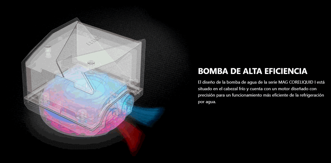 - Bomba de alta eficiencia: El diseño de la bomba de agua de la serie MAG CORELIQUID I está situado en el cabezal frío y cuenta con un motor diseñado con precisión para un funcionamiento más eficiente de la refrigeración por agua.