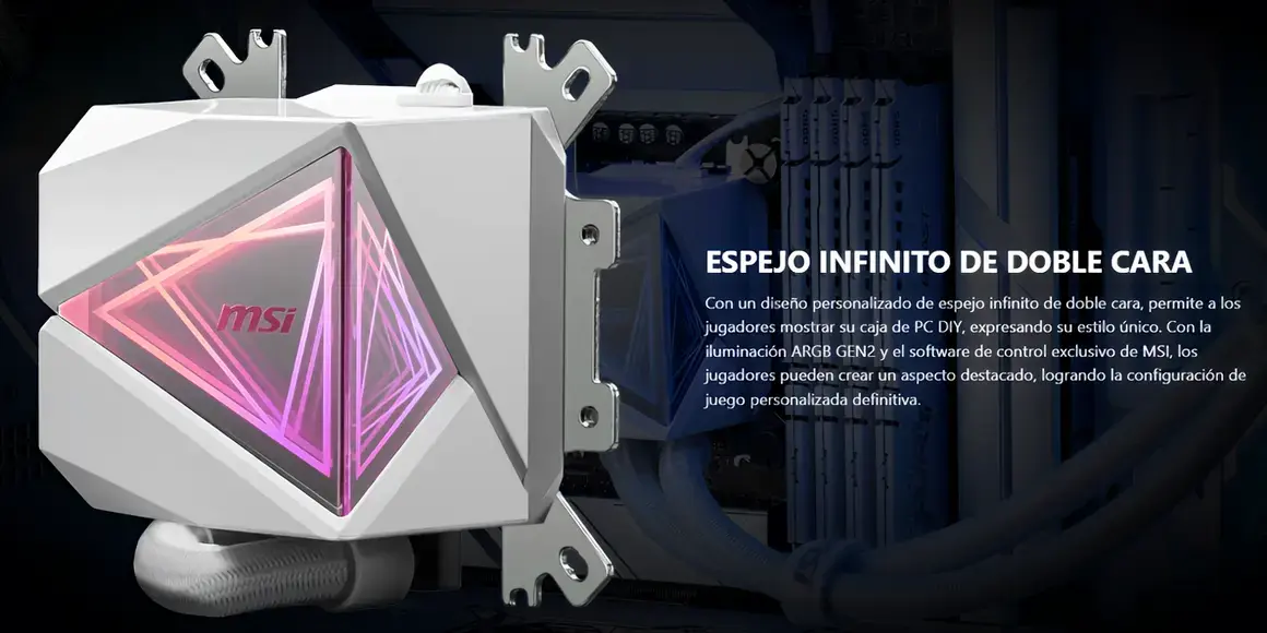 - Espejo infinito de doble cara: Con un diseño personalizado de espejo infinito de doble cara, permite a los jugadores mostrar su caja de PC DIY, expresando su estilo único. Con la iluminación ARGB GEN2 y el software de control exclusivo de MSI, los jugadores pueden crear un aspecto destacado, logrando la configuración de juego personalizada definitiva.