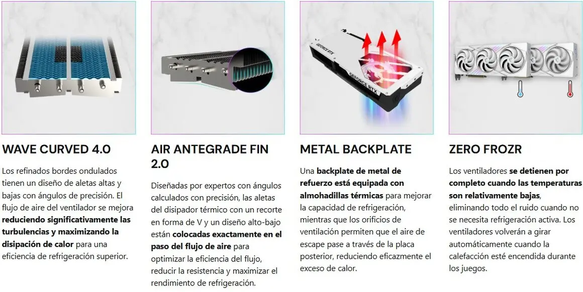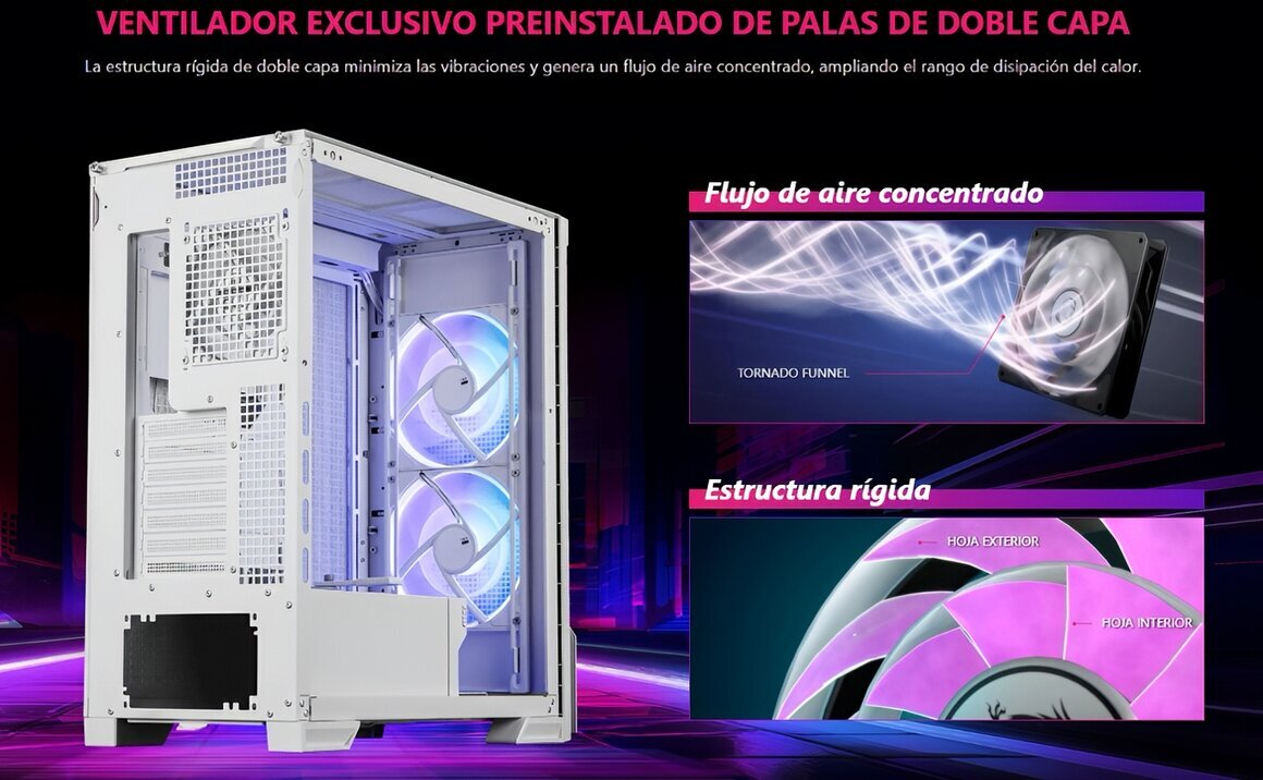 - El ventilador de aspas de doble capa consta de anillos exteriores e interiores que giran simultáneamente, creando un flujo de aire concentrado y mejorando la disipación de calor.